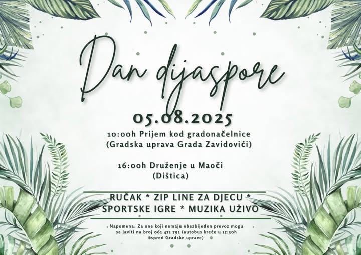 Sutra (5. augusta) u organizaciji Gradske uprave Zavidovići će biti upriličeno okupljanje zavidovićke dijaspore, odnosno, Dan zavidovićke dijaspore.