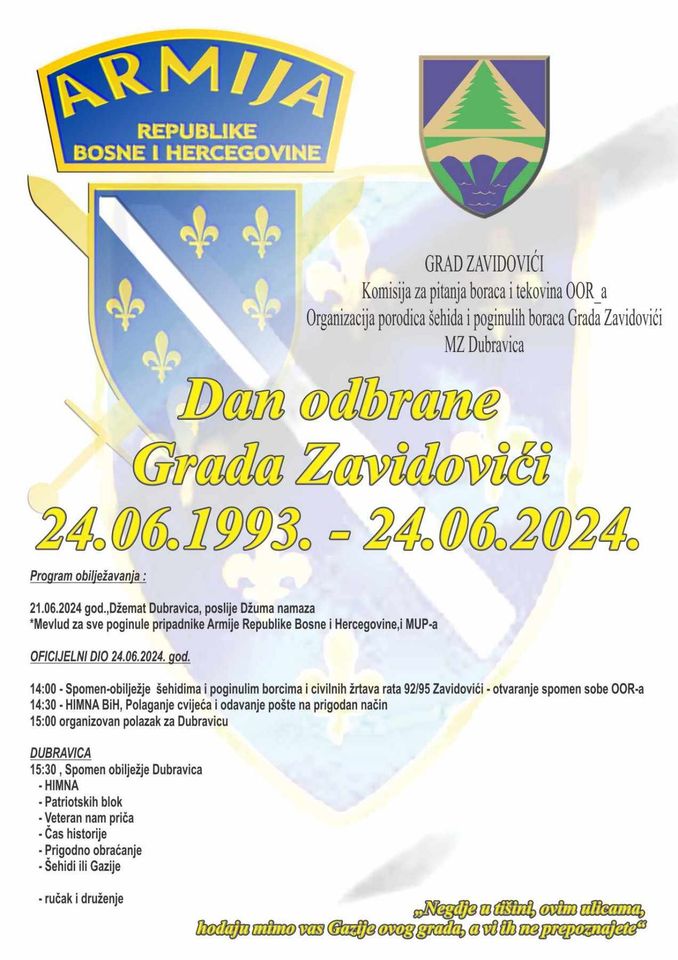 Sutra će prigodnim programom i odavanjem počasti biti obilježen Dan odbrane grada Zavidovići i sjećanje na 24. juni 1993. godine.