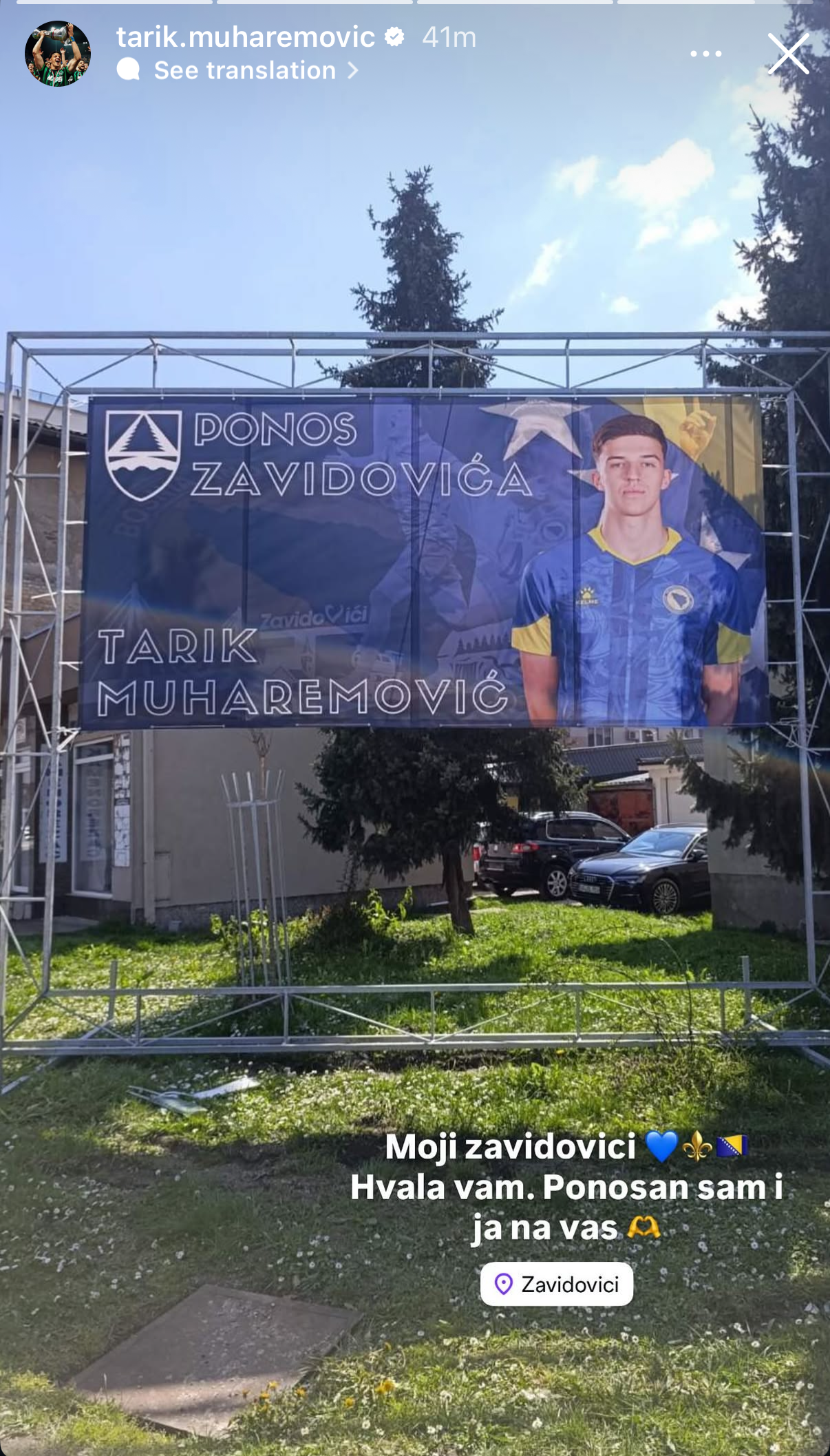 Večeras je putem svog Instagram profila Tarik Muharemović postavio fotografiju njegov banera uz poruku: Moji Zavidovići. 💙⚜️🇧🇦 Hvala vam. Ponosan sam i ja na vas. 🫶