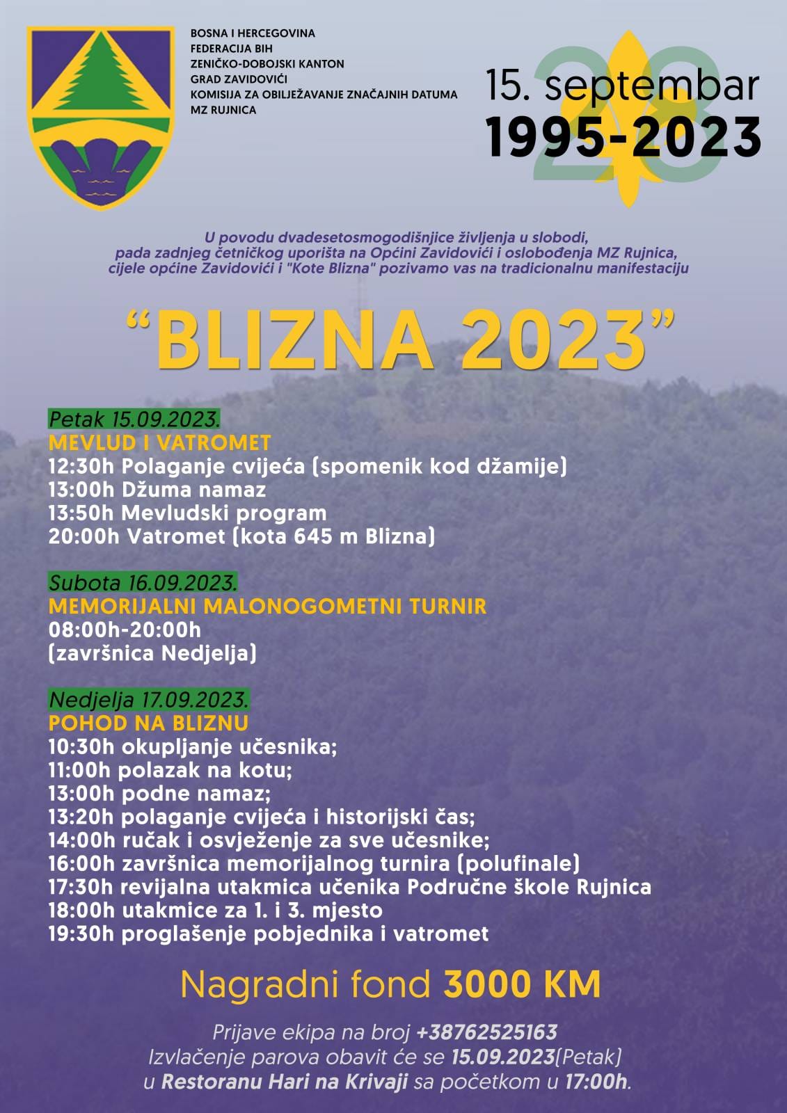 U subotu će početi memorijalni turnir “Blizna 2023”, a kako već niz godina to tradicija nalaže, za nedjelju je planiran pohod na kotu, historijski čas i obraćanje zvanica te odigravanje završnice malonogometnog turnira.
