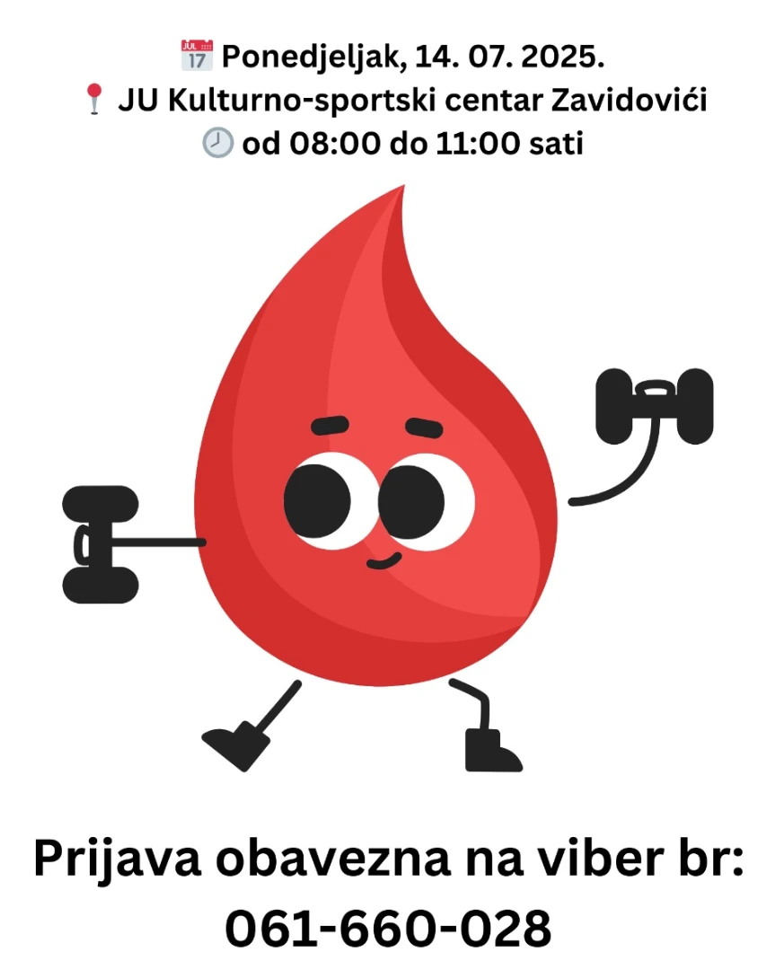 Akcija će trajati od 8 do 11 sati u prostorijima JU “Kulturno-sportski centar” Zavidovići, a prijave se obavezne putem kontakt telefona navedenog na plakatu.