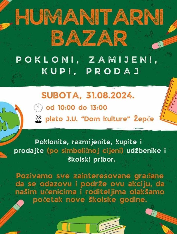 U subotu, 31. avgusta, u Žepču će biti organizovan humanitarni bazar u cilju pomoći učenicima i roditeljima u povodu nove školske godine.