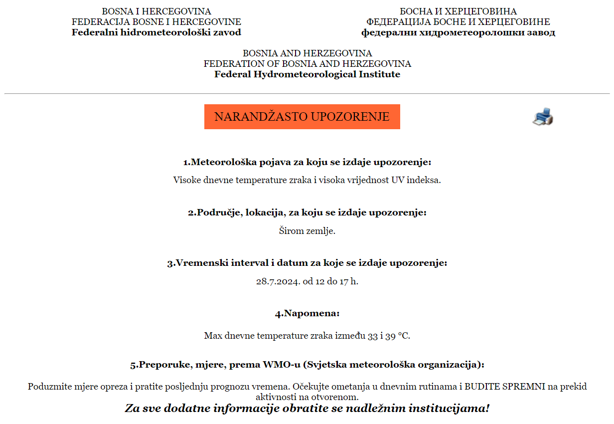 Upozorenje se odnosi na cijelu Bosnu i Hercegovinu, a u vremenskom intervalu od 12 do 17 sati. Maksimalne dnevne temperature zraka će biti između 33 i 39°C.