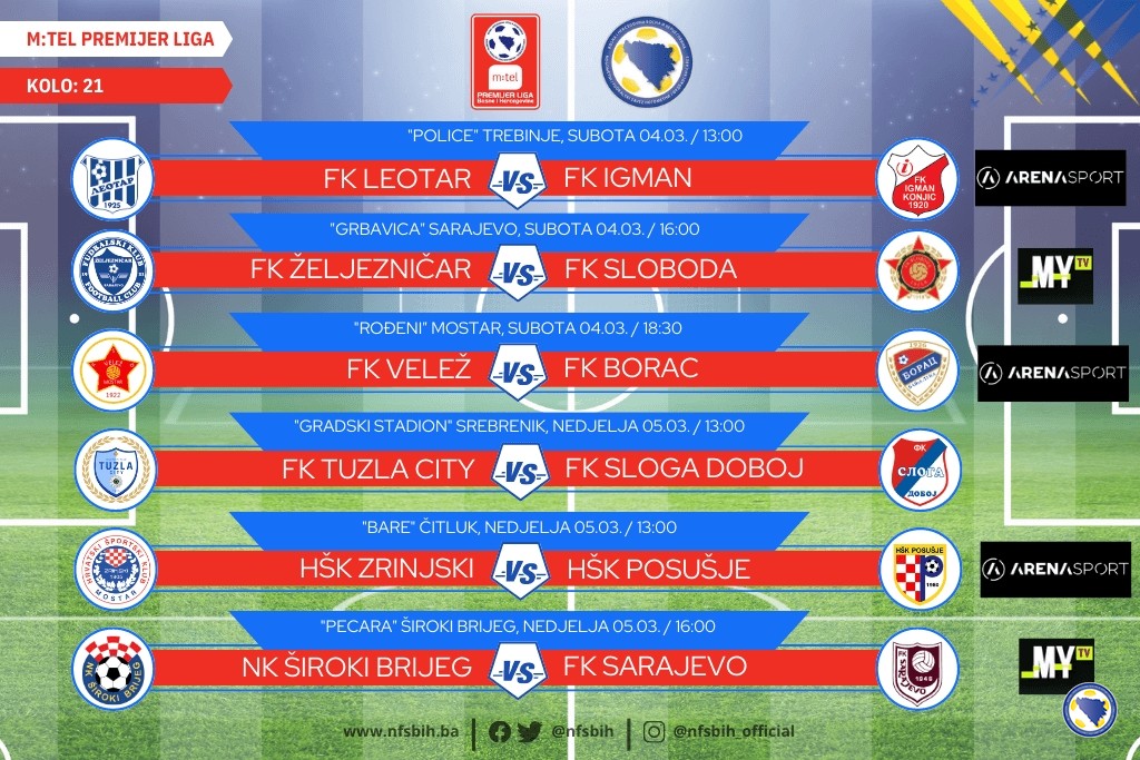 Ovog vikenda na zelenim terenima u Bosni i Hercegovini bit će odigrani susreti 21. kola m:tel Premijer lige BiH u fudbalu.