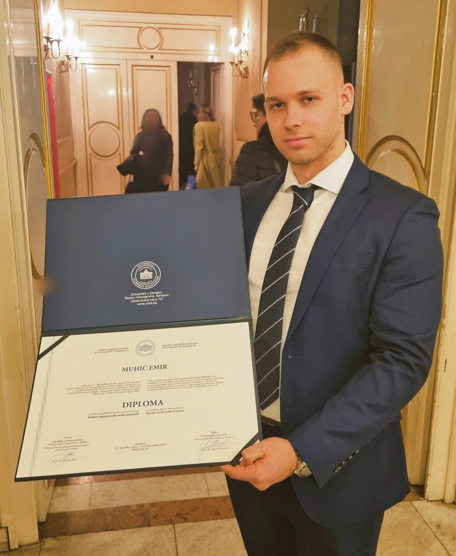 Među 63 promovisana doktoranta bio je i Emir Muhić iz Zavidovića, doktor sigurnosnih studija, a koji je odbranio doktorsku disertaciju pod naslovom “Teoretsko-metodološki aspekti specijalnog rata”.