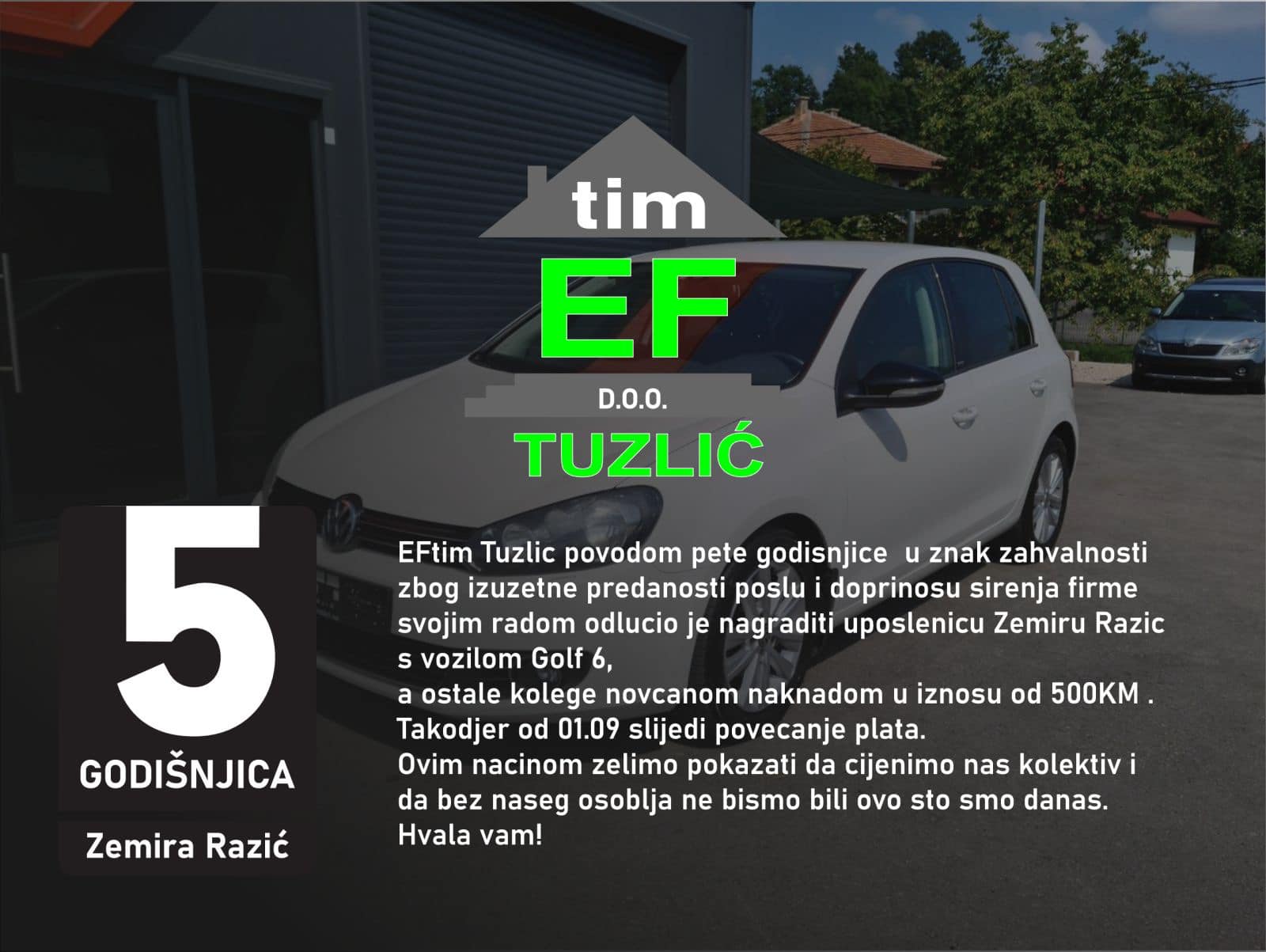 Fehim Tuzlić, povodom pete godišnjice poslovanja svog preduzeća EFTim Tuzlić, najbolju radnicu je nagradio automobilom Golf 6.