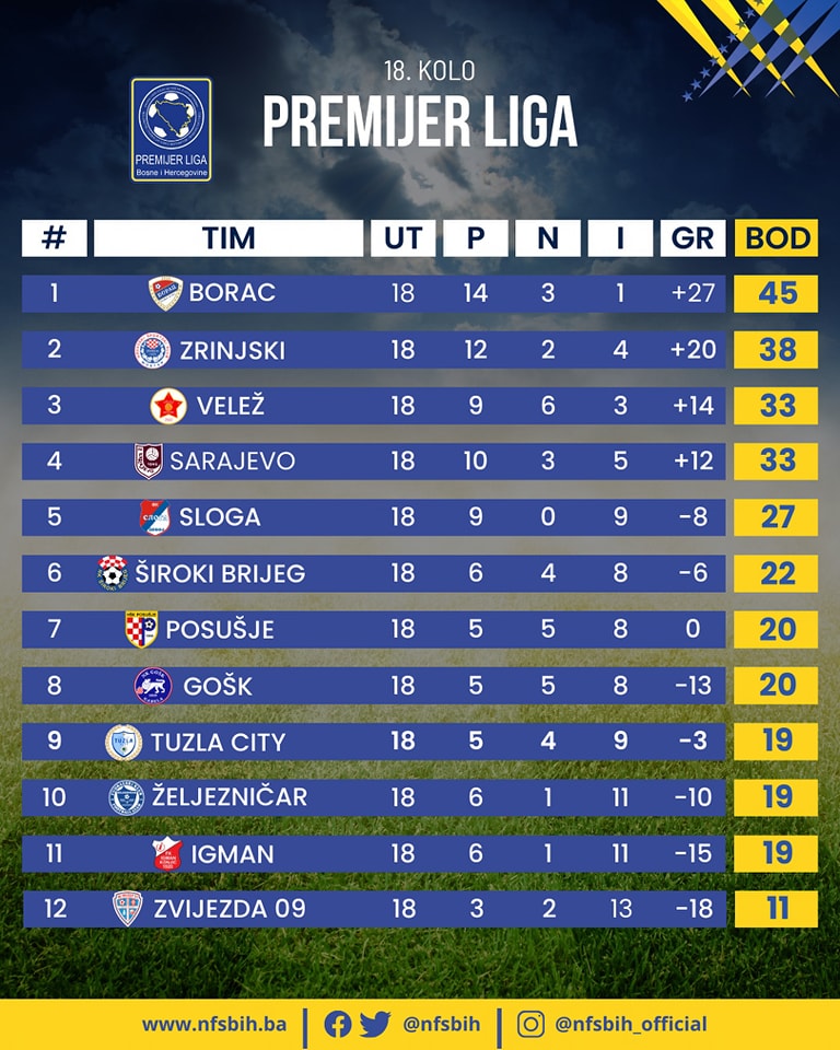 Nakon jesenjeg dijela prvenstva, prvi na tabeli je Borac sa 45 bodova, sedam više od drugoplasiranog Zrinjskog. Treći je Velež sa 33 boda, koliko ima i četvrtoplasirano Sarajevo.