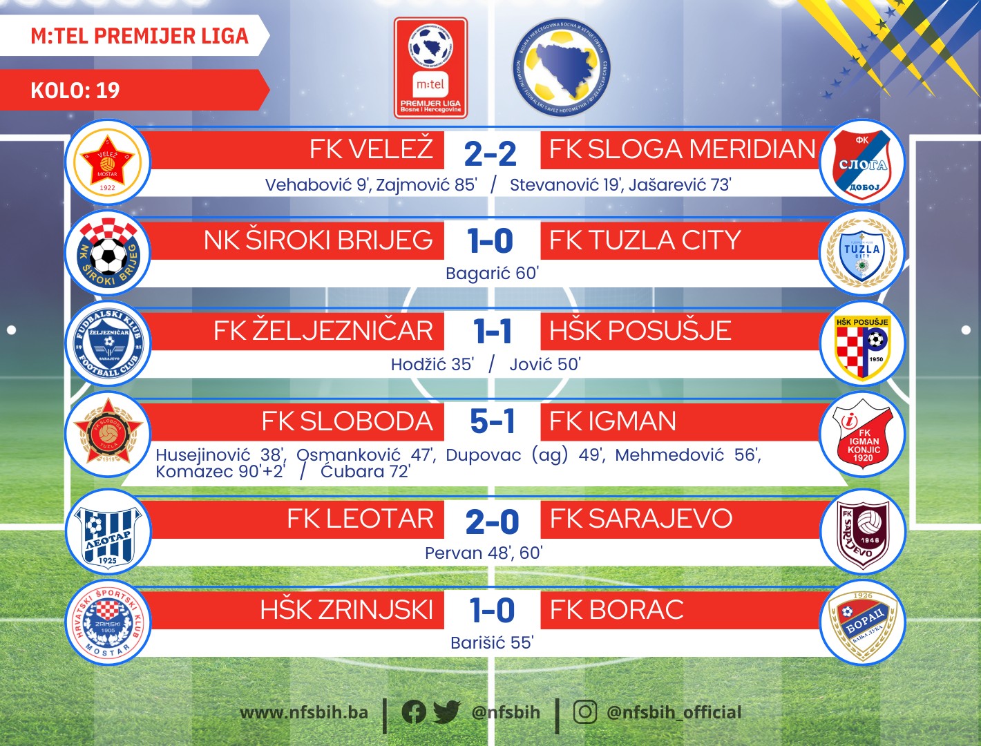 Danas je u Trebinju Leotar s 2:0 porazio Sarajevo, dok je Sloboda u Gradačcu s 5:1 deklasirala Igman. U derbiju gola Zrinjski je s 1:0 bio bolji od Borca, čime su Plemići ovjerili prvo mjesto prije odlaska na odmor.