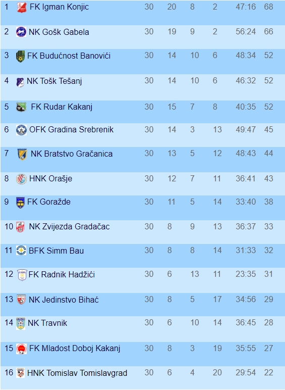 Igman je jučer u Konjicu savladao FK Goražde sa 2:0 i tako sezonu završio sa 68 bodova, dva više od drugoplasiranog NK GOŠK kojem je tako bila nedovoljna jučerašnja minimalna pobjeda u Maglaju protiv BFK Simm Bau.