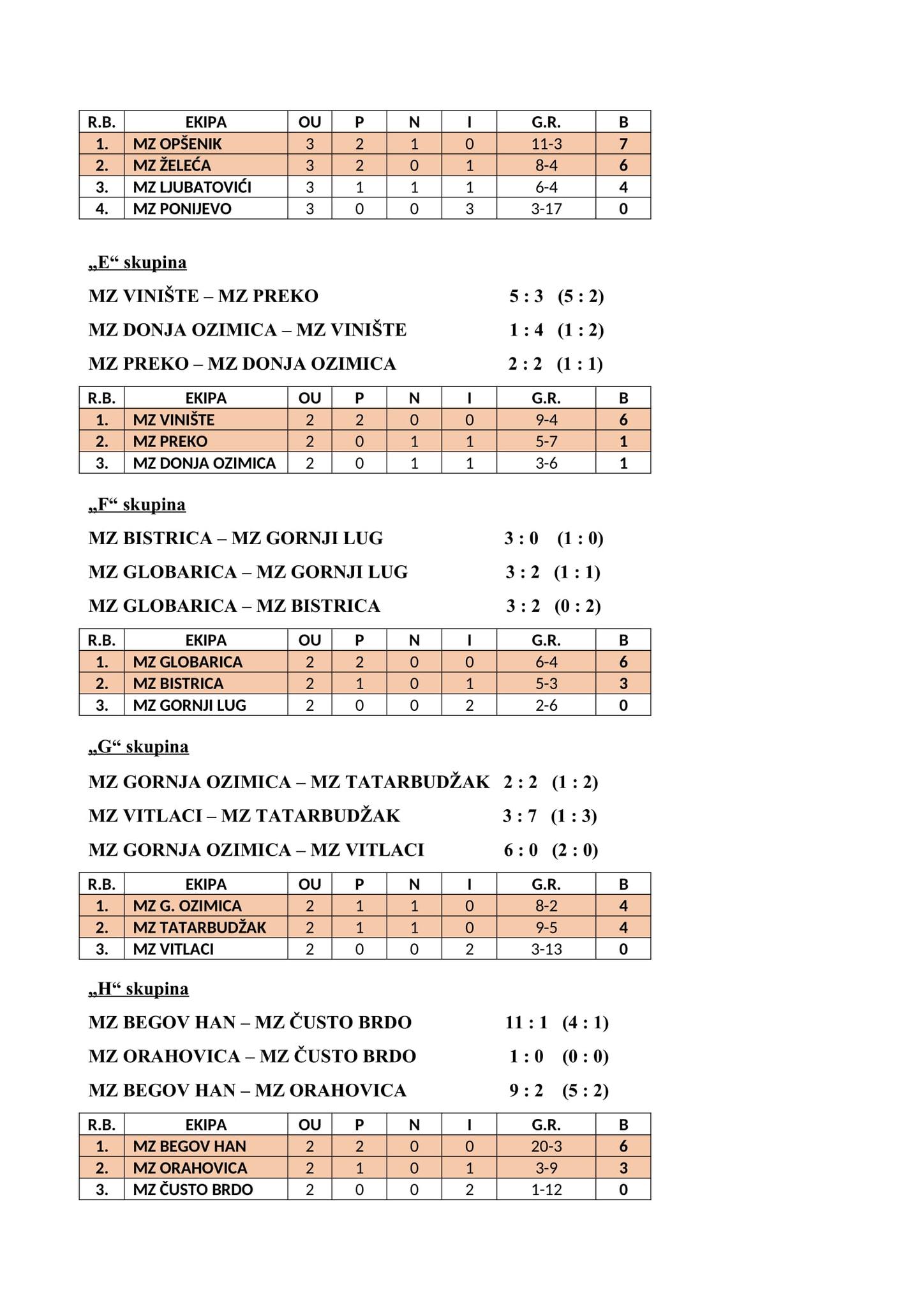 U naredni krug se plasiralo 16 mjesnih zajednica, a među njima s maksimalnim učinkom od dvije pobjede prošle su MZ Ljubna, MZ Lug-Brankovići, MZ Željezno Polje, MZ Vinište, MZ Globarica i MZ Begov Han.