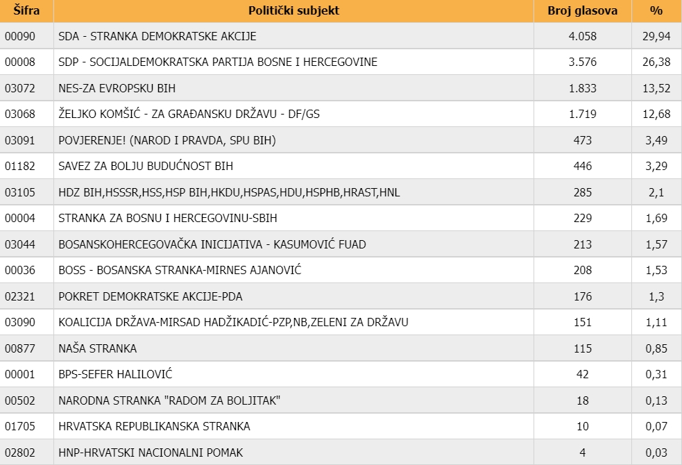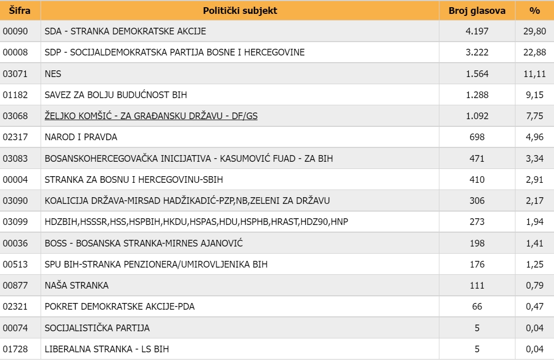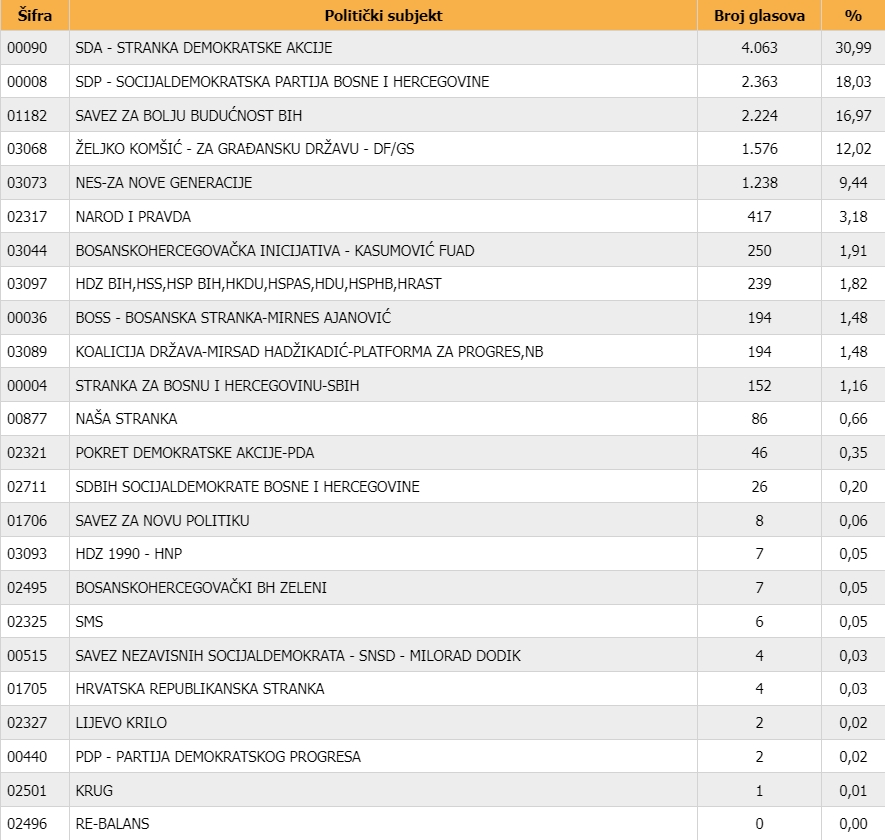 Na listi SDA kandidatkinja Erna Merdić Smailhodžić je osvojila skoro 2600 preferencijalnih glasova, a Rasim Mujkić blizu 1300. Kod SDP-a je Damir Memić dobio preko 1700 glasova, te Adi Mahovac više od 1000 glasova. Samir Karahasanović je imao preko 1000 glasova na listi NES-a, a za Amru Jupić na listi SBB-a je glasalo 800 birača.