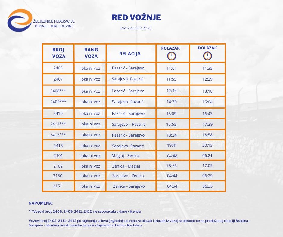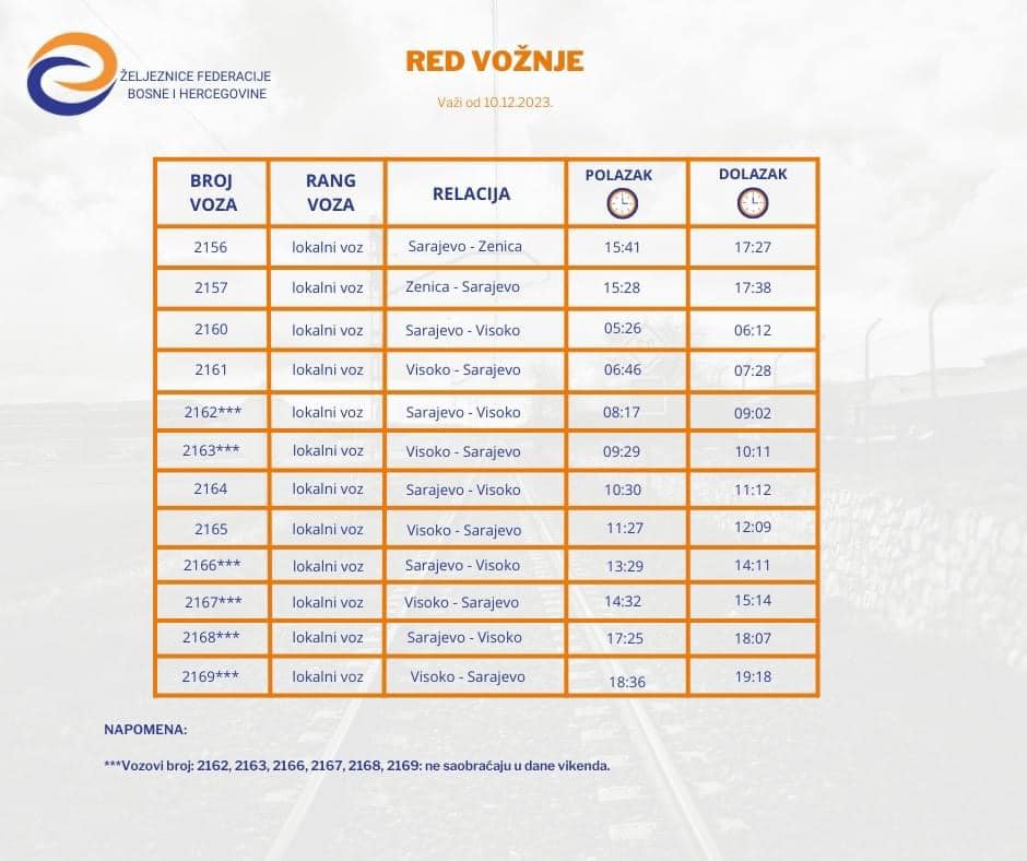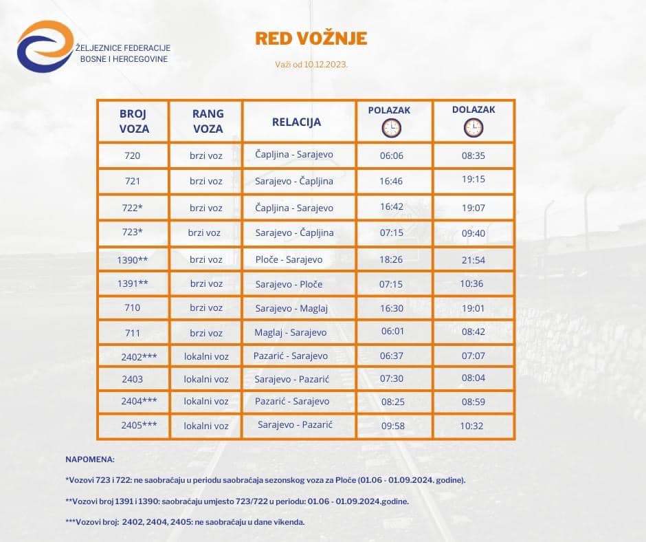 Iz JP Željeznice FBiH obavijestili su javnost da će u ponoć 09/10. decembar 2023. godine stupiti na snagu novi Red vožnje Željeznica Federacije Bosne i Hercegovine za 2023/2024. godinu.