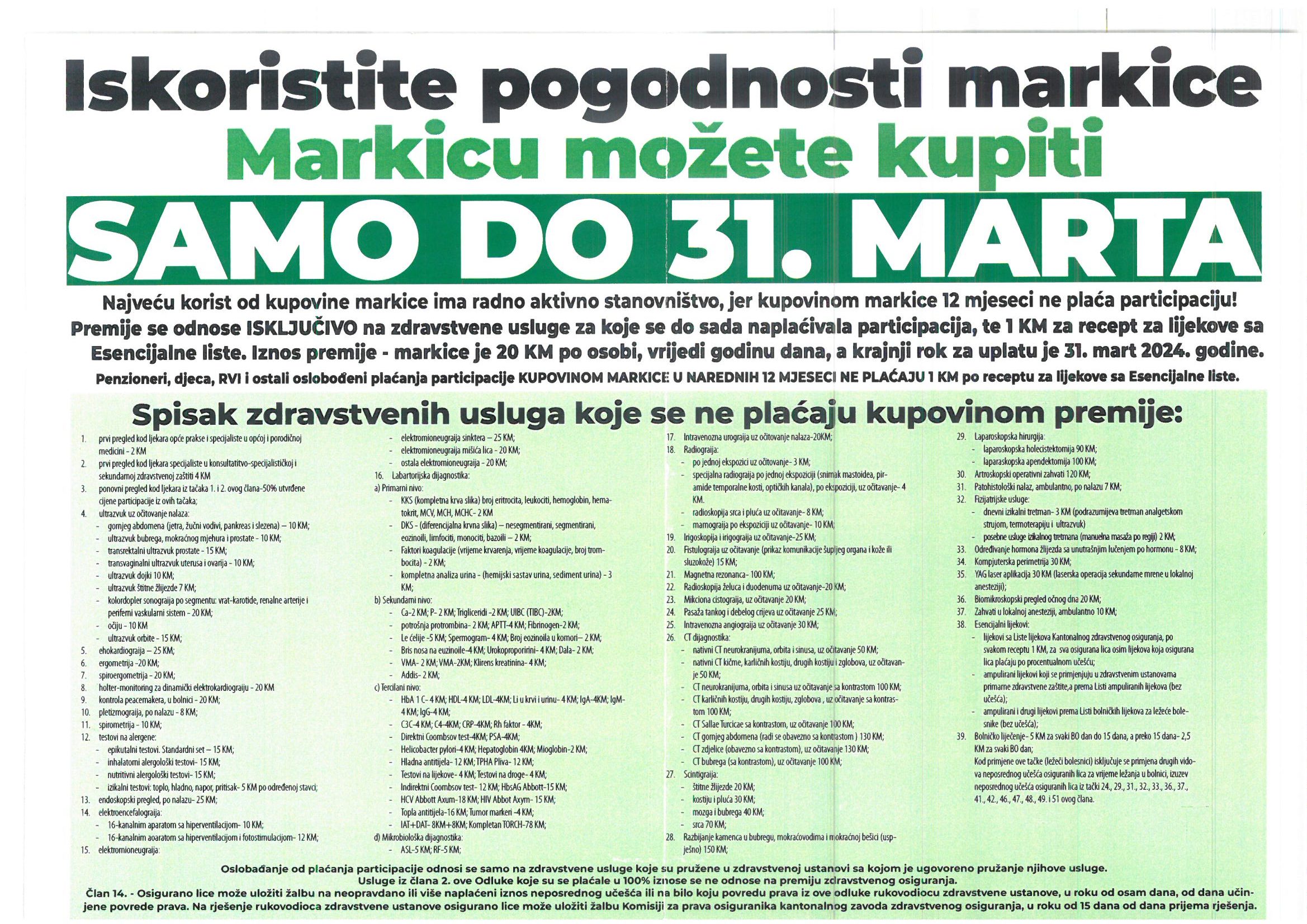 Markica se može kupiti do 31. marta tekuće godine, a cijena je nepromijenjena te iznosi 20 KM. Kupovinom markice osiguranicima se omogućavaju brojne pogodnosti, a najveću korist ima radno aktivno stanovništvo koje kupovinom markice, u narednih 12 mjeseci ne plaća participaciju za ukupno 39 usluga, a koje su vidno istaknute u obavijesti na našoj službenoj internetskoj stranici“, navodi direktor ustanove Omer Škaljo.