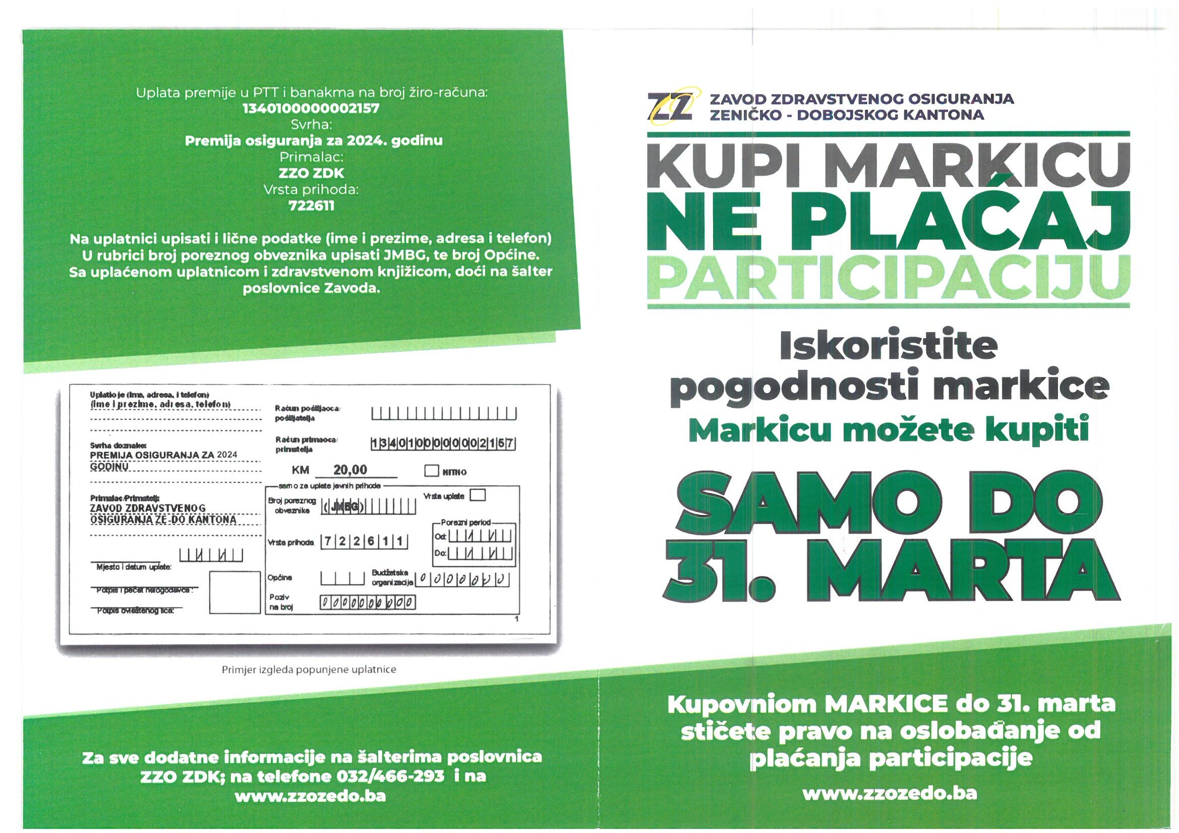 Zavod zdravstvenog osiguranja Zeničko-dobojskog kantona (ZZO ZDK), tradicionalno prvog radnog dana u godini, počeo je svoju kampanju “Kupi markicu ne plaćaj participaciju”, odnosno s prodajom premije osiguranja koja i za 2024. godinu iznosi 20 KM.